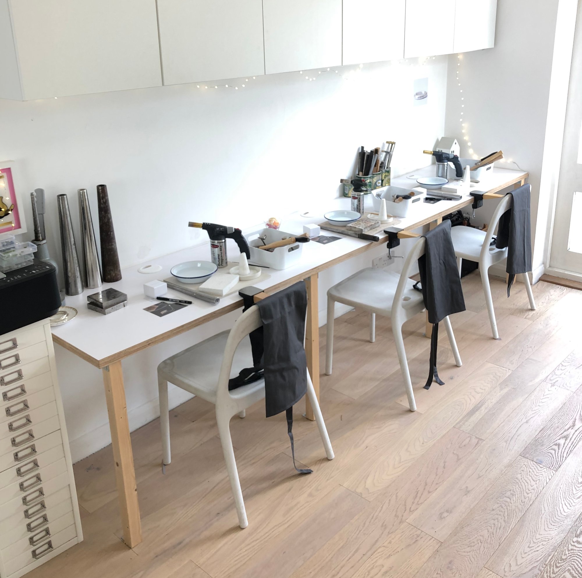 The courses take place in my well equipped jewellery studio in S W London (Hampton Hill). Maximum class size is five students. Please note the studio is attached to the side of my house and accessed through the house.