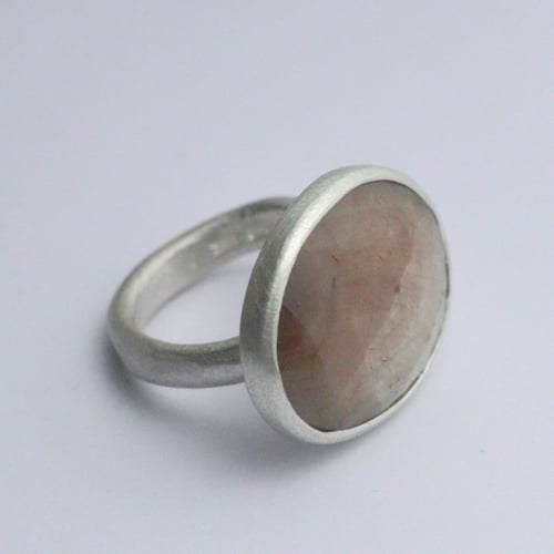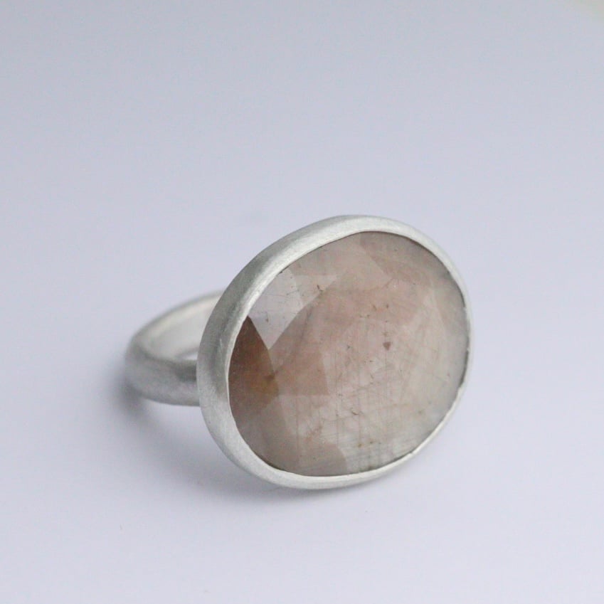 The sapphire sits on a sterling silver ‘maxi ’ Organic collection uneven ring band which is approx 4mm wide. The silver has been given a soft brushed finish.